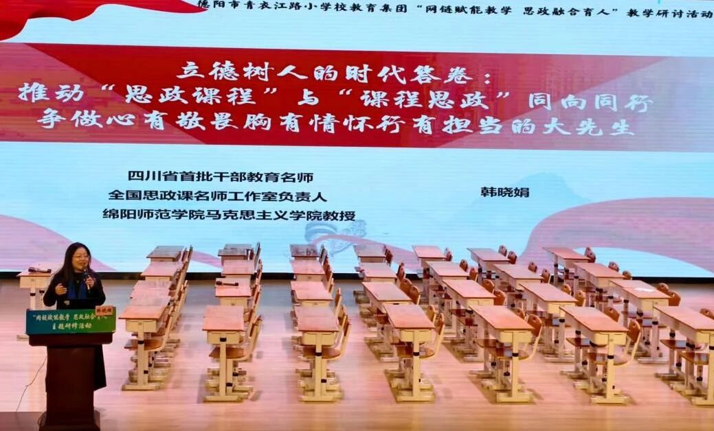 为全面落实立德树人根本任务,推动课程思政与思政课程同向同行。近日,德阳市中小学课程思政建设研讨活动在德阳市青衣江路小学顺利举行。我校马克思主义学院、全国思政课名师工作室教师团队受邀参加本次活动。其中,马克思主义学院院长、全国思政课名师工作室负责人韩晓娟教授在研讨会上作了题为《做心有敬畏、胸有情怀、肩有担当的“大先生”》的专题报告,系统阐述了课程思政的内涵理解、实践方法与育人体系。